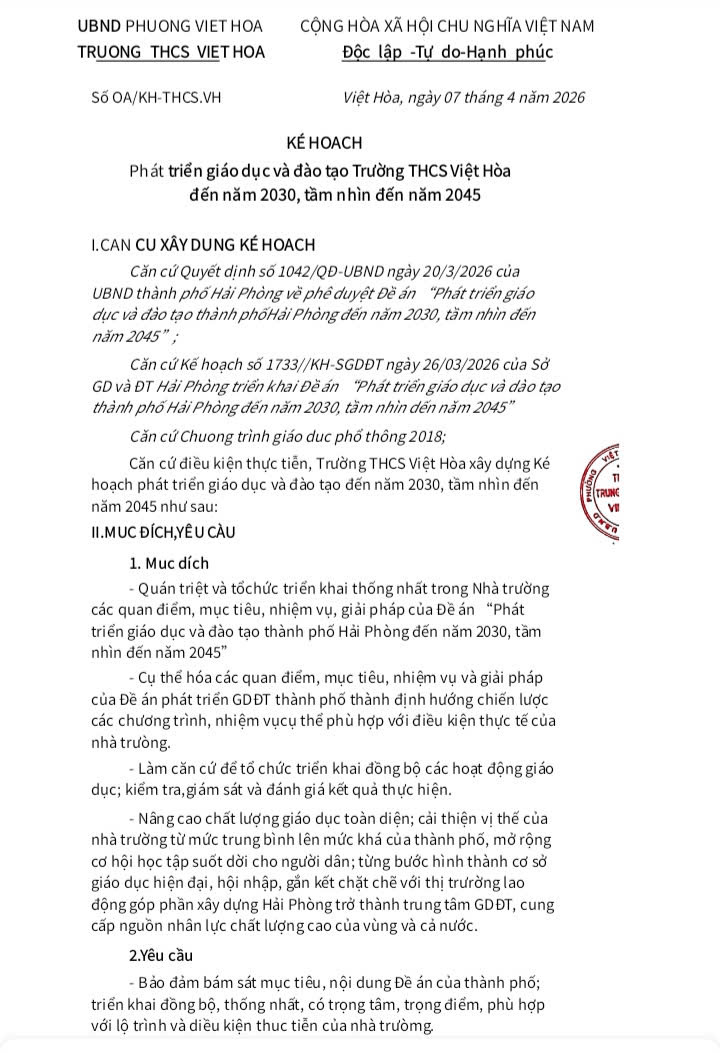 Kế hoạch phát triển giáo dục và đào tạo trường THCS Việt Hòa giai đoạn 2030-2045 ...